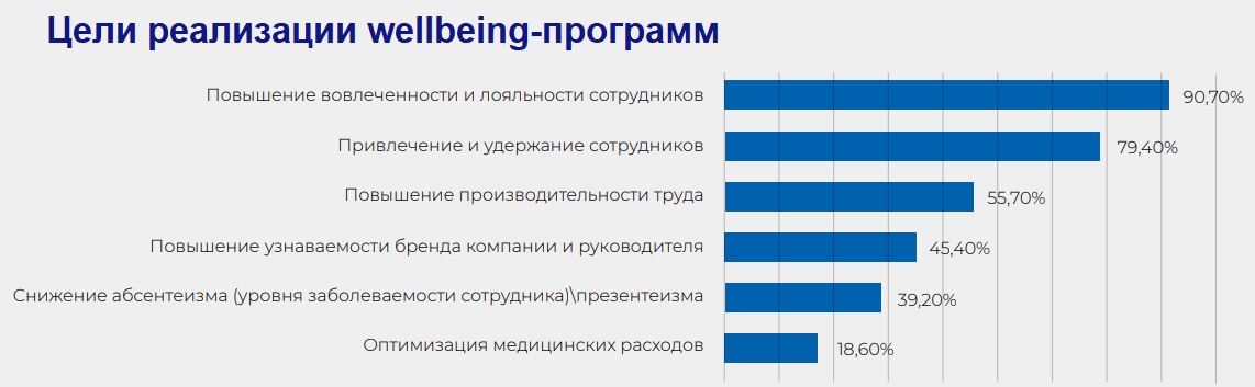 Интересно, что по данным опроса журнала "Льготы и бенефиты" за 2021 год, ключевыми целями реализации данных программ российские работодатели выделяют именно "повышение вовлеченности и лояльности сотрудников", а также "привлечение и удержание сотрудников". То есть, по сути, решение их ключевых HR-задач — увеличение вовлеченности и снижение текучести.