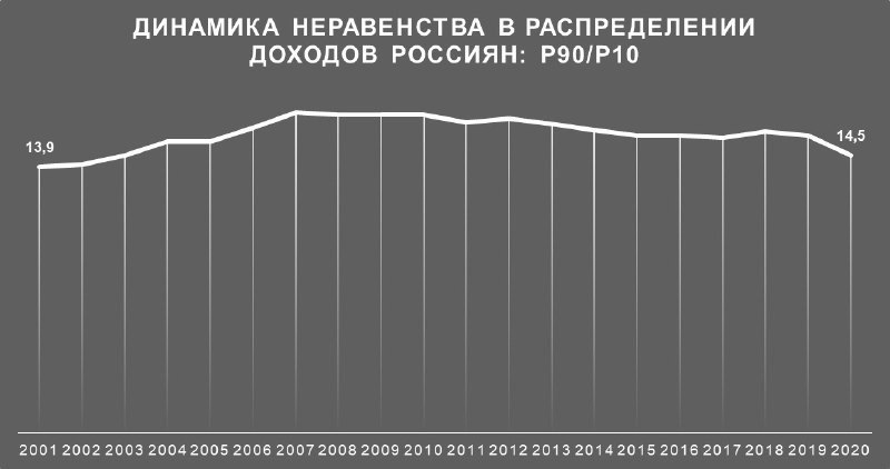 Согласно данным Росстата неравенство доходов россиян не уменьшилось за последние 20 лет. Соотношение между средними уровнями денежных доходов 10% населения с самыми высокими доходами и 10% населения с самыми низкими доходами в среднем составляло 15,6 за данный промежуток времени.