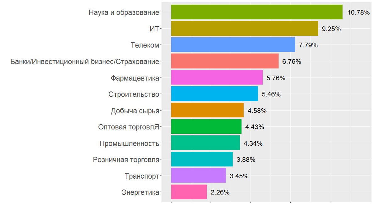 Я просто посчитал % тех, кто указал, что уволился по инициативе работодателя по отношению ко всем уволившимся в разрезе отраслей.