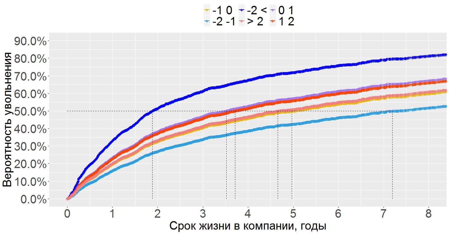 Смотрим диаграмму (Если хотите точнее разобраться, смотрите поясняющее видео , если вкратце, то чем правее линия, тем меньше риски увольнения, дольше жизнь в компании – по оси X – срок / стаж жизни в компании, а по оси Y – вероятность увольнения, чем круче кривая вздымается вверх, тем круче растут риски увольнения. Те, кто получают меньше всех по группе, живут в среднем в компании менее 2 лет, а самая долгоживущая группа живет в компании в среднем более 7 лет, но эта группа не те, кто получает больше всех).