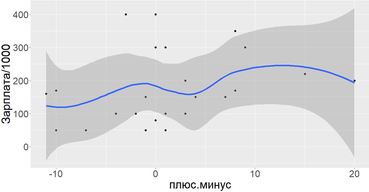 Я знаю другое. У меня студентка делала проект про факторы зарплат хоккеистов – у нее муж хоккеист, и проект хороший способ контролировать доходы мужа. Ниже диаграмма связи зарплаты и показателя соотношения забитых / пропущенных шайб, пока хоккеист находился на площадке. Связь есть, если что