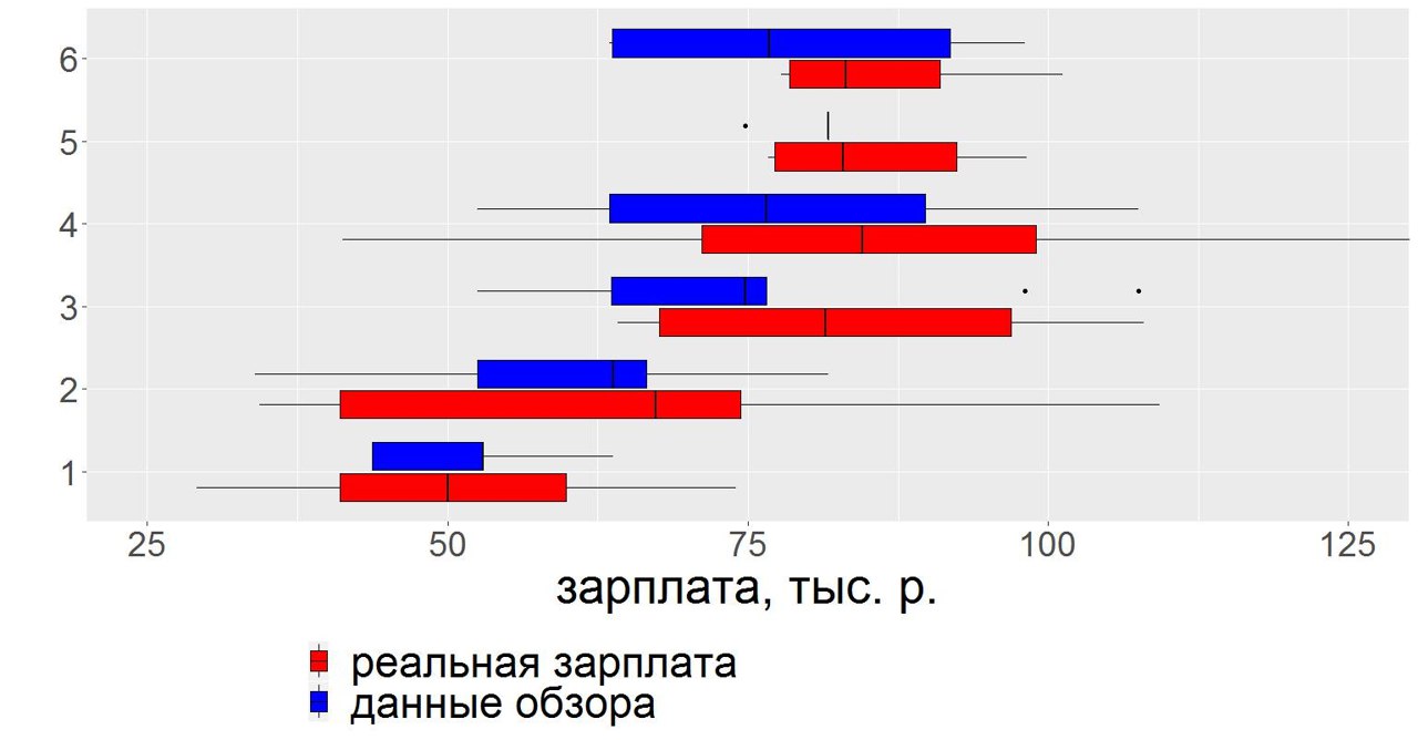 Красным показан разброс актуальной зарплаты компании, синим - зарплата по обзору. Данные по синим боксплотам были получены следующим образом: в excel файле с зарплатами компании напротив каждого специалиста была проставлена соответствующая зарплата из обзора.