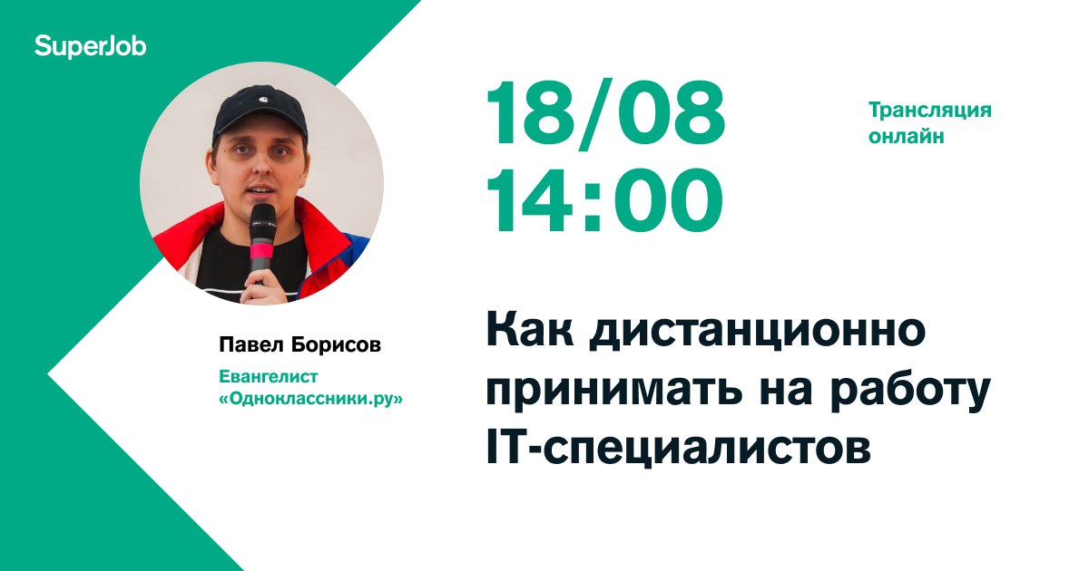 18 августа в 14:00 начнется вебинар "Как дистанционно принимать на работу IT-специалистов". Павел Борисов, евангелист "Одноклассники.ру" поделится опытом, как они настроили дистанционный найм, как проводят собеседования и что еще изменилось за последние полгода.