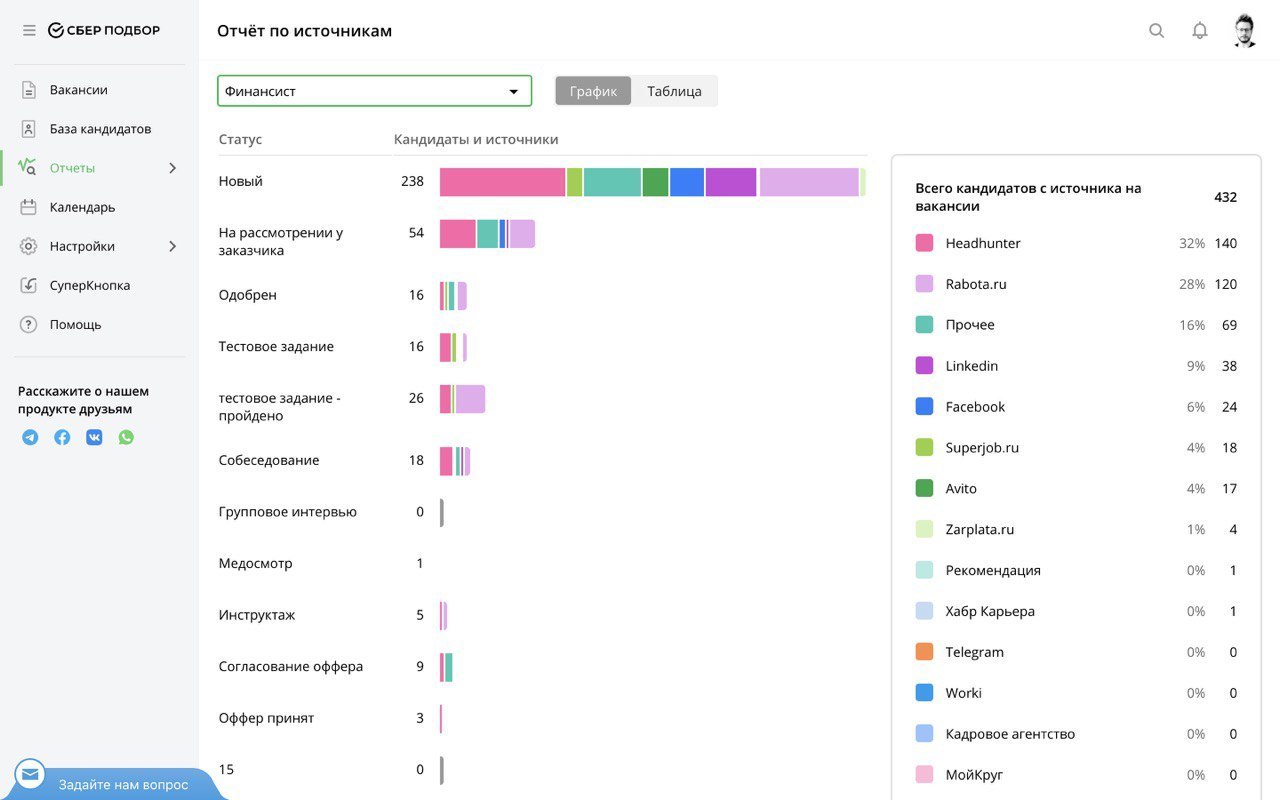 У пользователей СберПодбора, бесплатной ATS для работы с рекрутингом, есть возможность формировать аналитический отчет, где показаны источники, откуда были добавлены кандидаты, и данные о том, по какому каналу было больше всего приглашений, а по какому — отказов. Благодаря такому анализу вы сможете отказаться от неэффективных каналов и сэкономить бюджет.