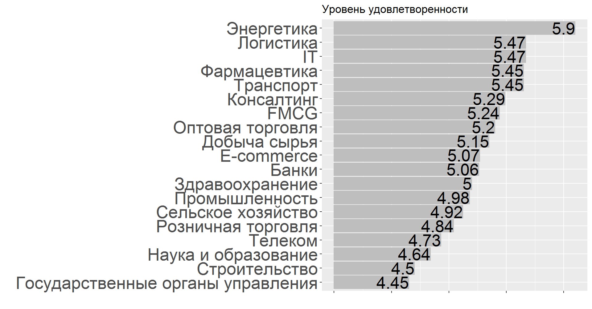 Или вот, например, на диаграмме ниже удовлетворенность работой в разрезе отраслей - тех, кто реально работает (по 7-ми бальной шкале, где 7 максимум удовлетворенности, 1 – минимум). Обратите внимание – это не хотелки, а среднее значение удовлетворённости тех, кто реально работает в отрасли.