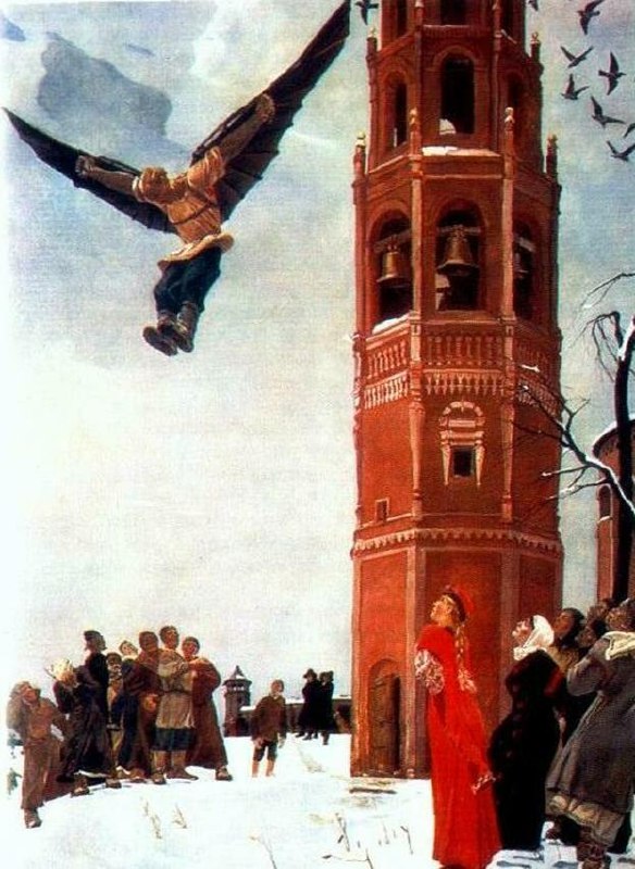 Художник писал картину на основе красивой легенды о русском Икаре, прыгнувшем с колокольни на глазах Ивана Грозного. Источники утверждают, что «смерд Никита, боярского сына Лупатова холоп», смастерив деревянные крылья, обмазал их воском, обвалял в пухе и «аки птица», полетел с Распятской колокольни. Полет оказался удачным.