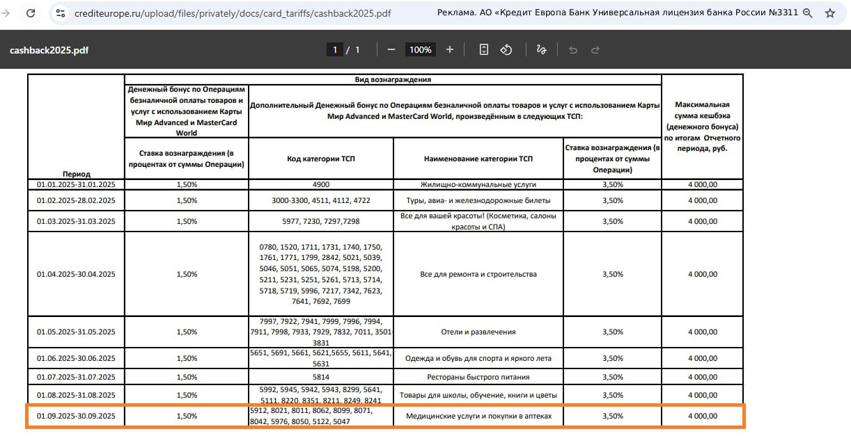 В сентябре по бесплатной дебетовой Card Plus от "Кредит Европа Банка" будет положен дополнительный кэшбэк 3,5% (т.е. всего 5%) на "Медицинские услуги и покупки в аптеках" (МСС: 5912, 8021, 8011, 8062, 8099, 8071, 8042, 5976, 8050, 5122, 5047).