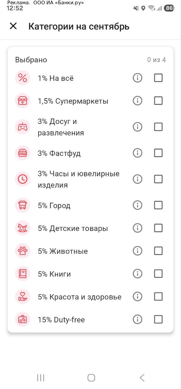 В "Т-Банке" тоже доступен выбор повышенных категорий кэшбэка на сентябрь (у всех разные).