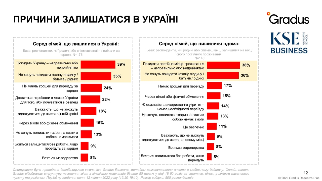 Покидати свій дім у такий час — неправильно, неприйнятно, така думка вийшла на перше місце серед причин залишатися у місці постійного проживання, та у країні в цілому, її озвучили 38% респондентів. На другому — небажання покидати близьких людей (35%). І навіть у разі загострення ситуації більше половини заявило про намір залишатися на місці.
