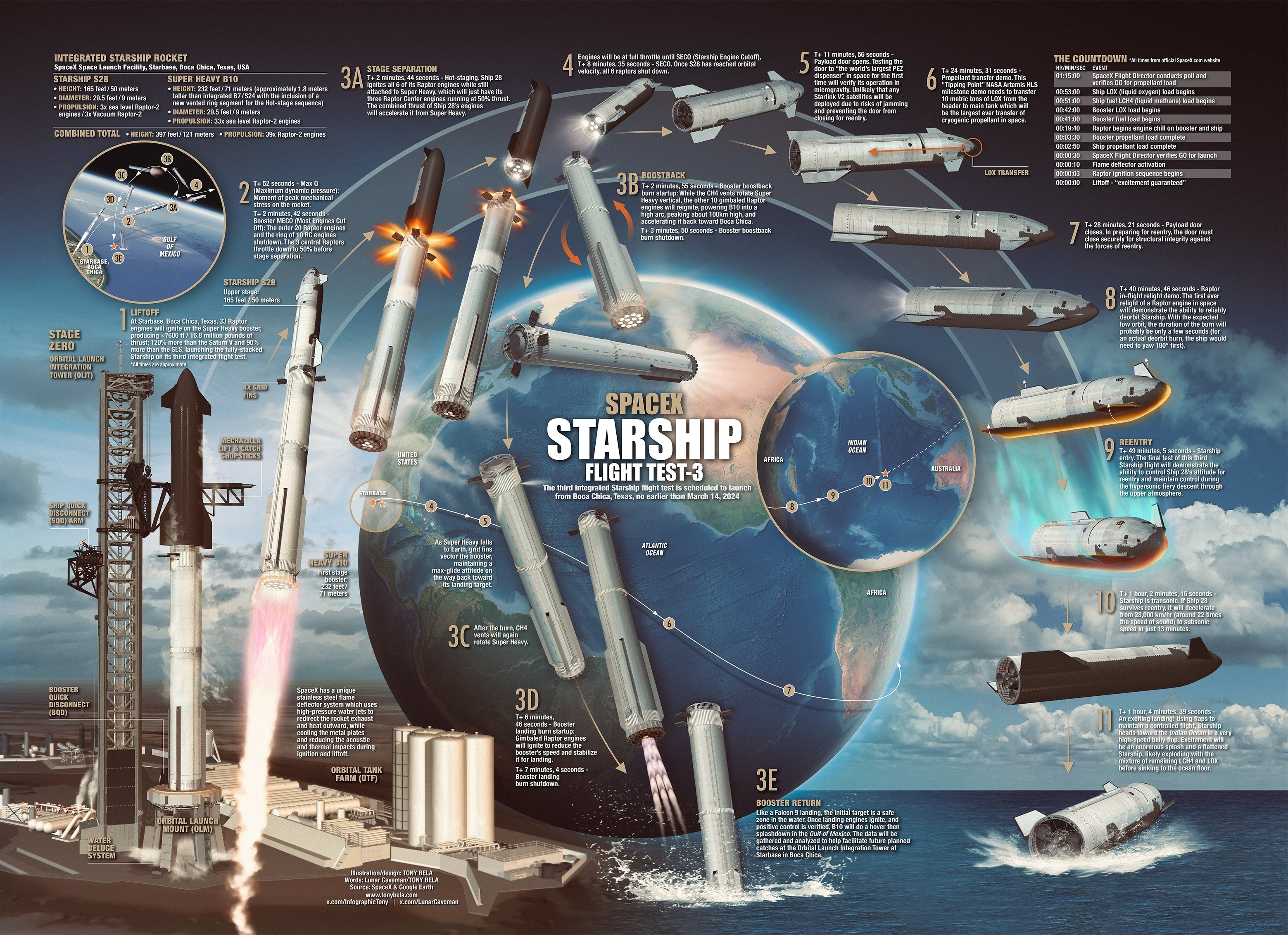 «Третье лётное испытание направлено на то, чтобы развить всё, чему мы научились в ходе предыдущих полётов, при этом ставится ряд амбициозных задач, включая успешное включение обеих ступеней при подъёме, открытие и закрытие люка полезной нагрузки Starship, демонстрацию перекачки топлива на разгонном блоке, первый в истории повторный запуск ракеты-носителя, запуск двигателя Raptor во время нахождения в космосе и контролируемое возвращение Starship», — сообщила SpaceX в описании миссии.