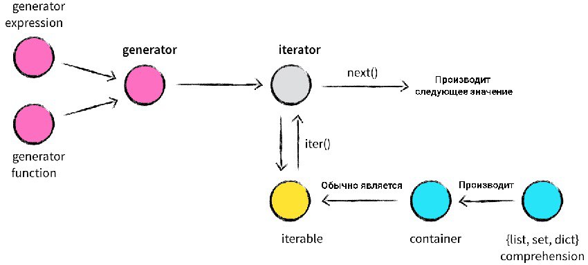 __next__() с передачей этого объекта в качестве аргумента. Таким образом, любой объект, предоставляющий метод __next__(), является итератором, возвращающим следующий элемент при вызове этого метода, при этом совершенно неважно как именно это происходит.Итак, итератор — это некая фабрика по производству значений. Всякий раз, когда вы обращаетесь к ней с просьбой "давай следующее значение", она знает как сделать это, поскольку сохраняет своё внутреннее состояние между обращениями к ней.