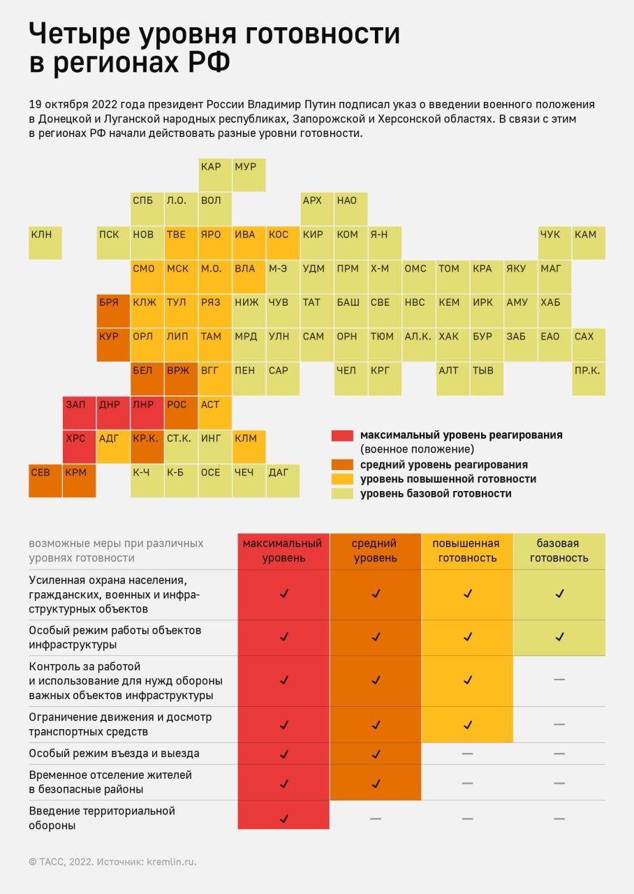 📆 На минувшей неделе Президент России ввёл военное положение в ДНР, ЛНР, Запорожской и Херсонской областях. Там продолжаются боевые действия. В Омской и Новосибирской областях действует базовый уровень готовности. Что это значит?