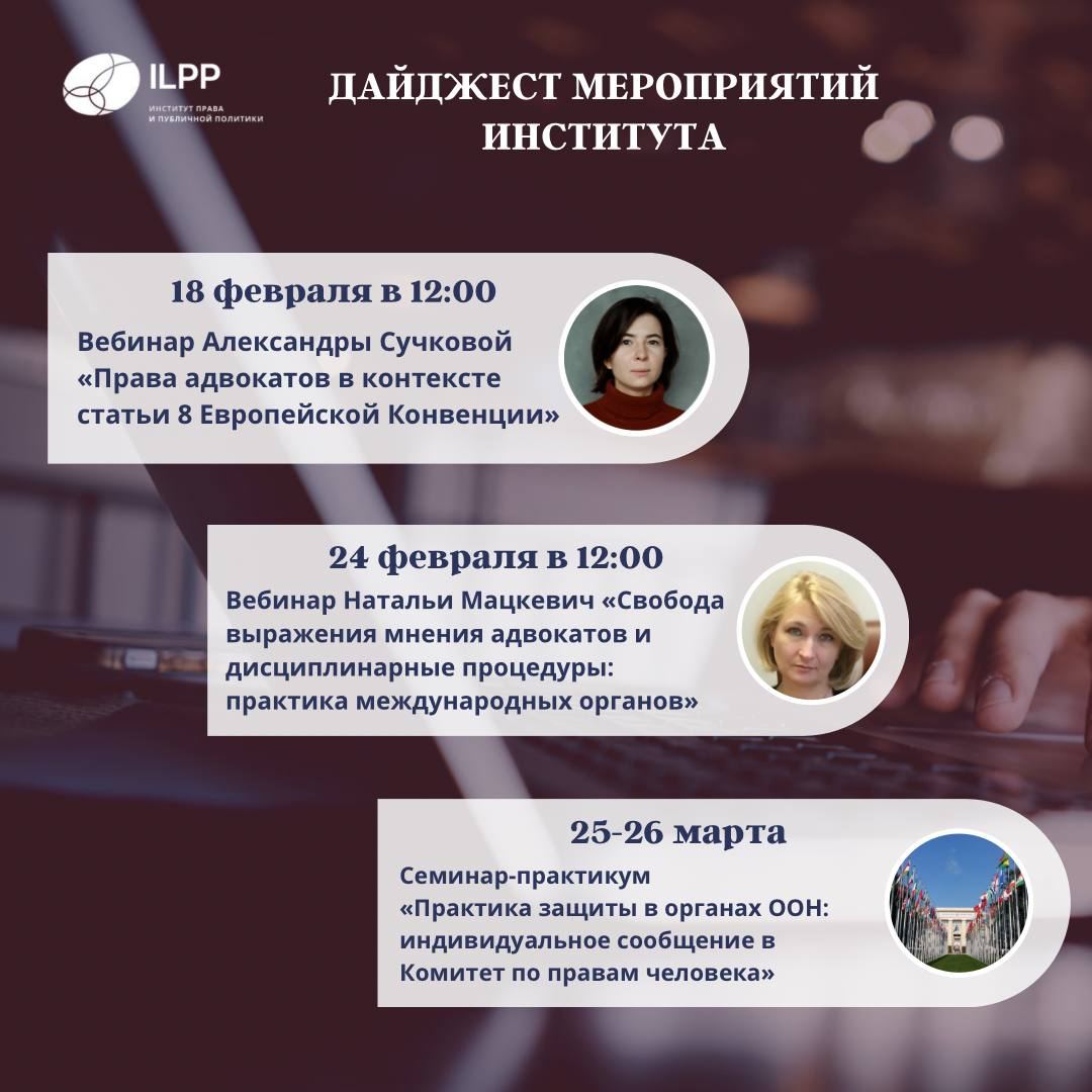 24 февраля Институт права и публичной политики (внесён в реестр «иноагентов») проведёт бесплатный вебинар о свободе выражения мнения адвокатов. Гостем встречи будет Наталья Мацкевич – эксперт по защите прав в ООН.