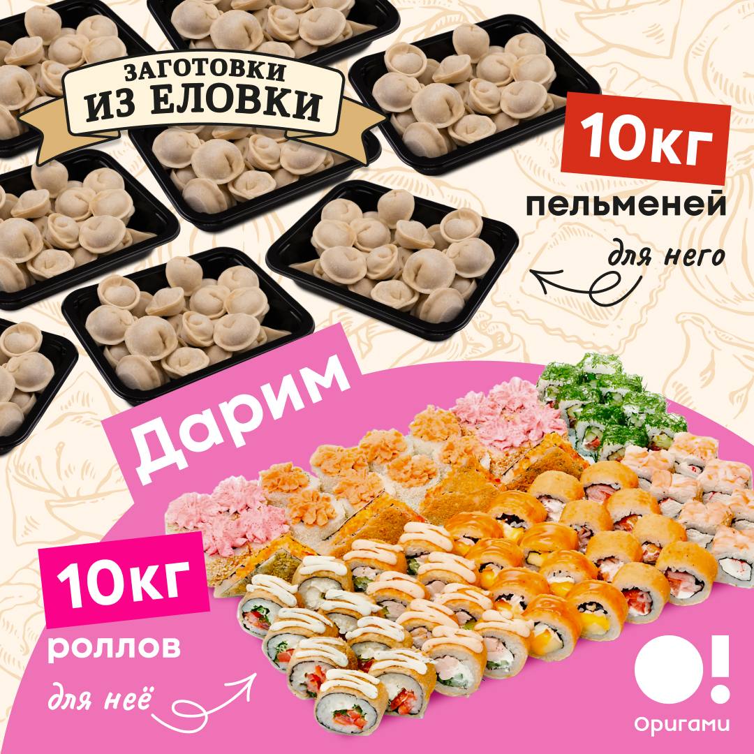 «Заготовки из Еловки» вместе с «Оригами» дарят 20 килограммов вкусной еды! Для него — сочные народные пельмени ручной лепки. Для неё — большой набор роллов!