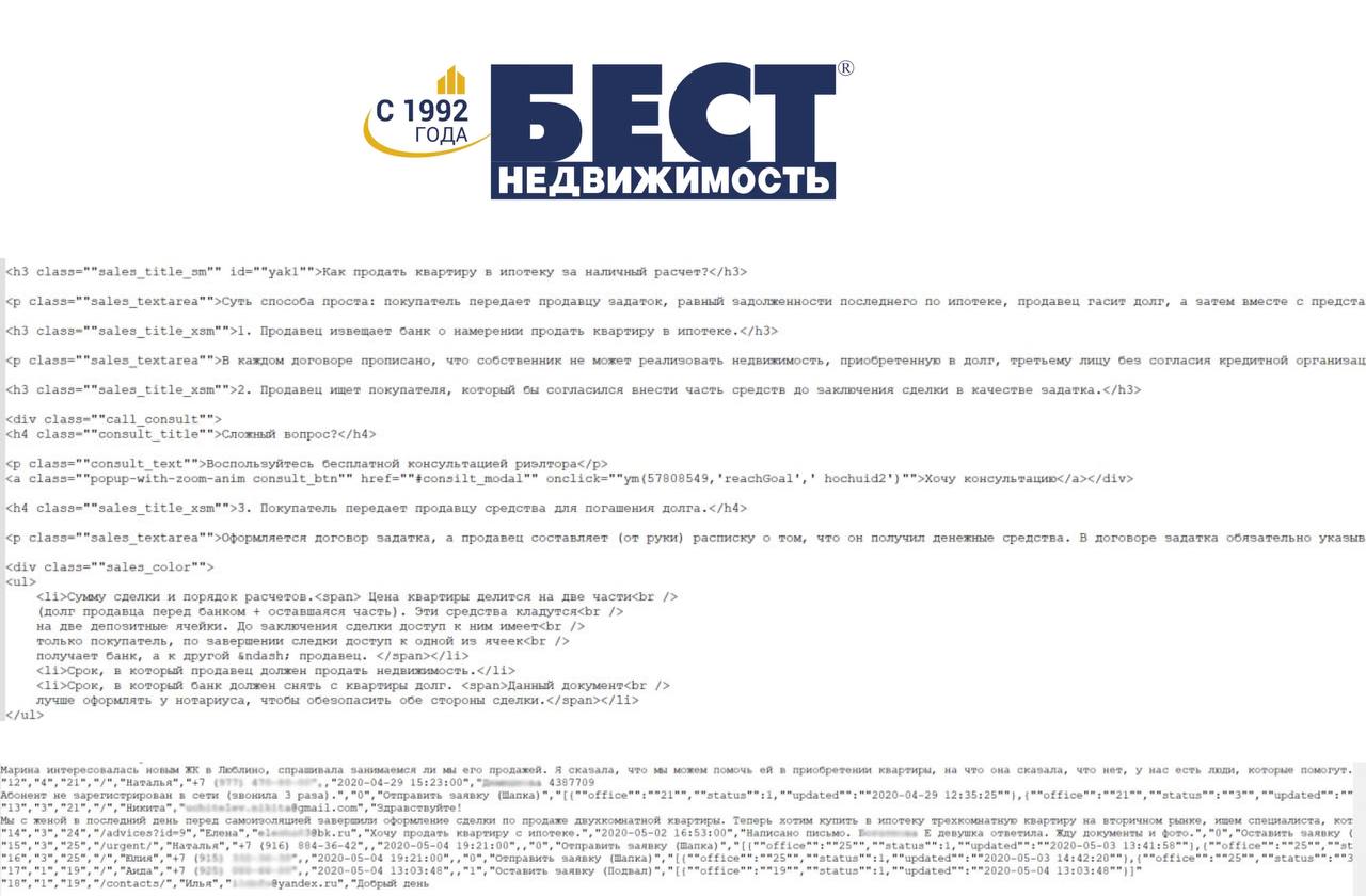 Некая иностранная хакерская организация слила данные, которые могут принадлежать риэлторской компании «БЕСТ Недвижимость», осуществляющей свою деятельность в Москве и Московской области с 1992 года. В открытый доступ попало 5 файлов – в общей сложности 733 115 строк.