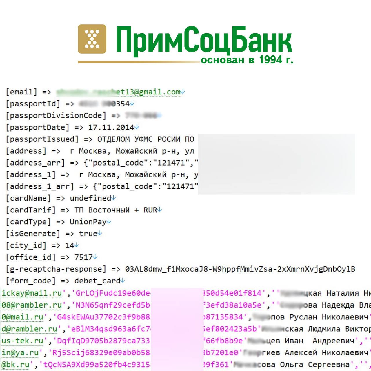 В открытом доступе найдены данные, которые могут иметь отношение к ПримСоцБанку. Дамп состоит из двух файлов: logcard и pskb_users.