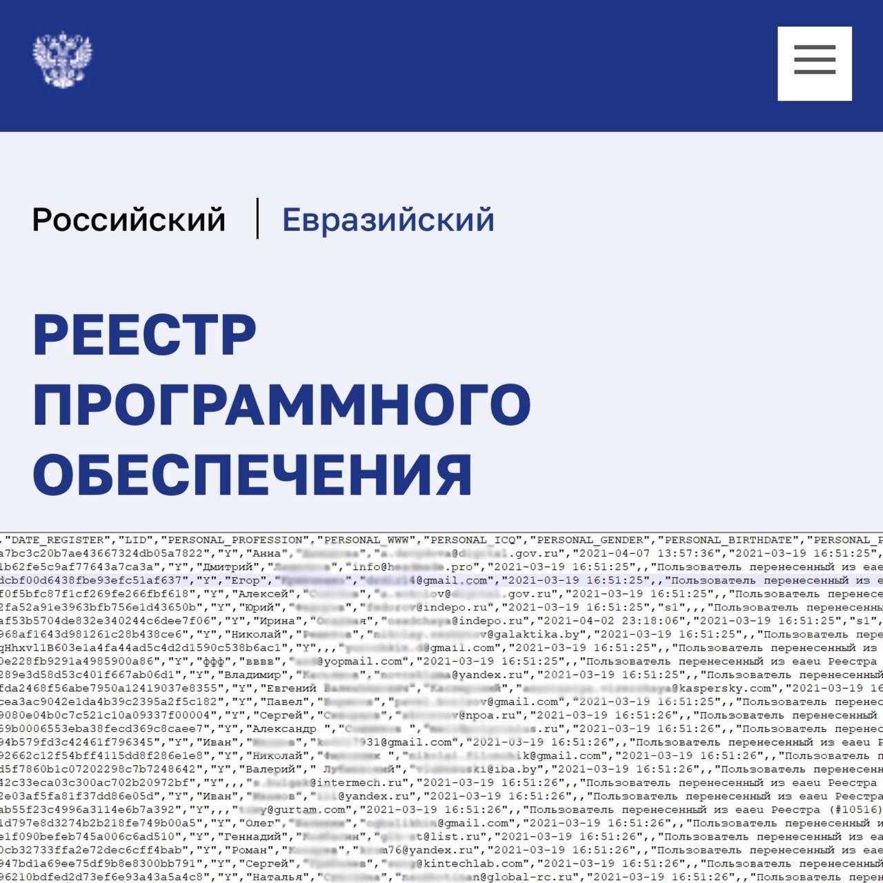В Сеть попала информация, похожая на часть базы данных портала «Реестр программного обеспечения» Министерства цифрового развития РФ. База состоит из логинов, паролей, кодовых слов, ФИО, дат регистрации и последней авторзации пользователей, а также иной информации. Всего – более 20 тыс. строк.