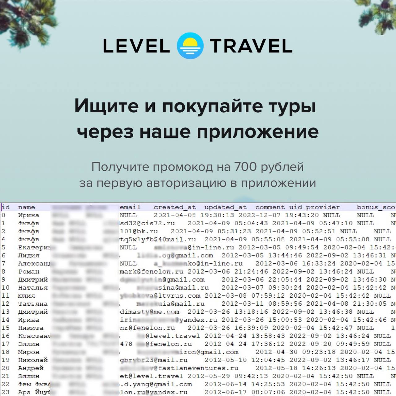 В Сети обнаружена база данных, которая может принадлежать онлайн-сервису по поиску туров Level.travel. База состоит из 3 файлов и более 2,9 млн строк. По наполнению: паспортные данные, ФИО, даты рождения, телефоны, адреса электронных почт, пароли, ID, даты последней авторизации, метод оплаты и иная информация.