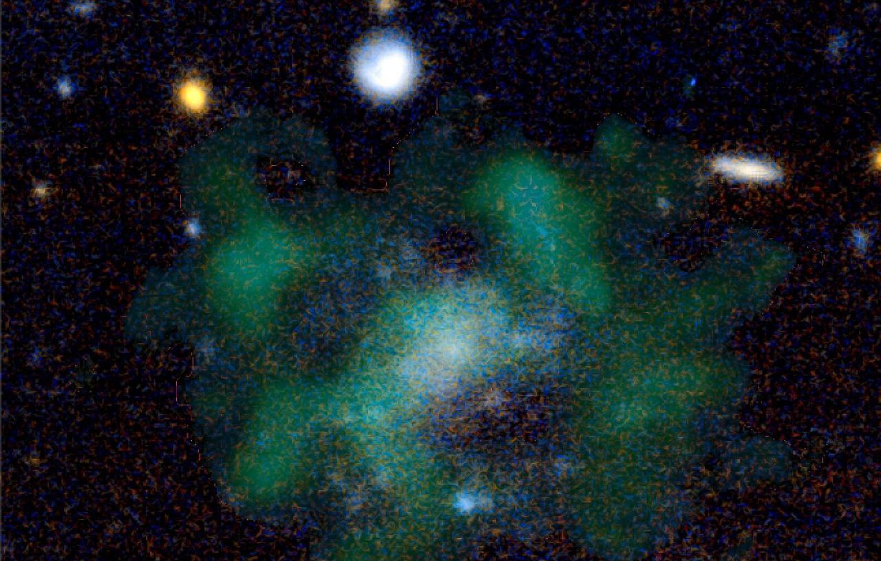 На фото: Галактика AGC 114905 (Звездное излучение галактики показано синим цветом. Зеленые облака показывают нейтральный водород)