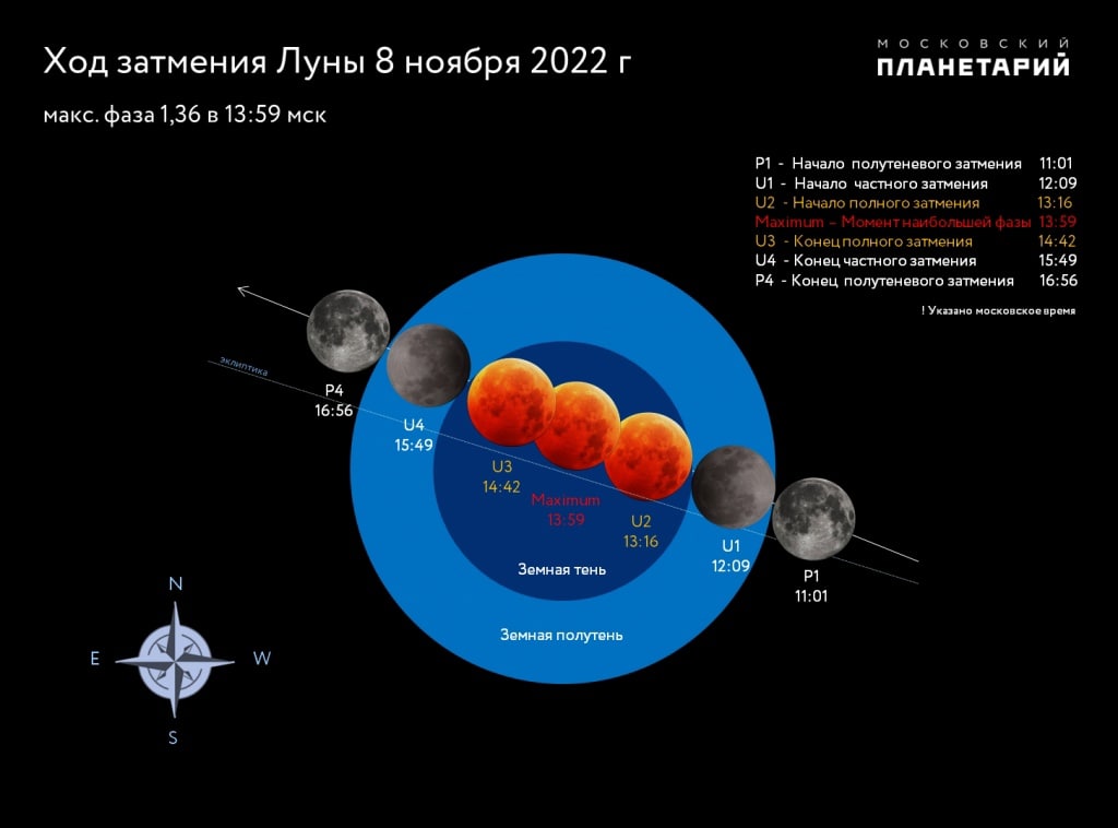 Затмение 8 ноября 2022 года лучше всего будет наблюдаться в восточной половине России. Максимальная фаза затмения 1,36 будет доступна для наблюдений в Сибири,