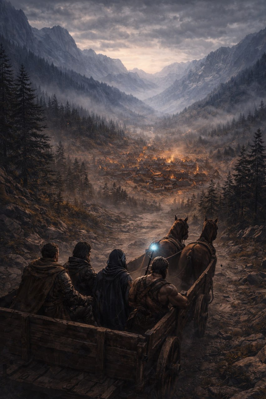 Дорога веде між гір — тут проходить торговий шлях, головна артерія королівства. По ньому тече золото, чутки й біди, прямуючи до столиці. Вам до неї ще далеко. Зате карта обіцяє інше: десь попереду має бути поселення. Їжа. Тепло. Ніч без тривоги.