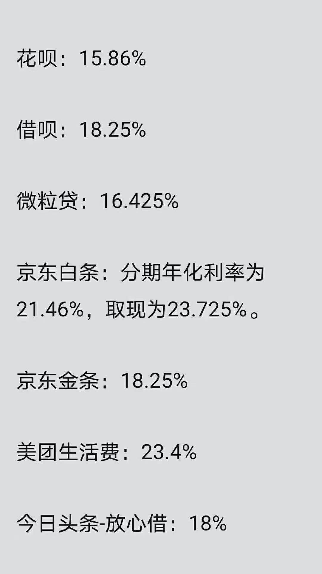 央行一出手,都老老实实换算成年化利率:花呗15.86%、借呗18.25%、微粒贷16.425%、京东白条23.725%,费率换算成年化利率,惊呆了有木有?