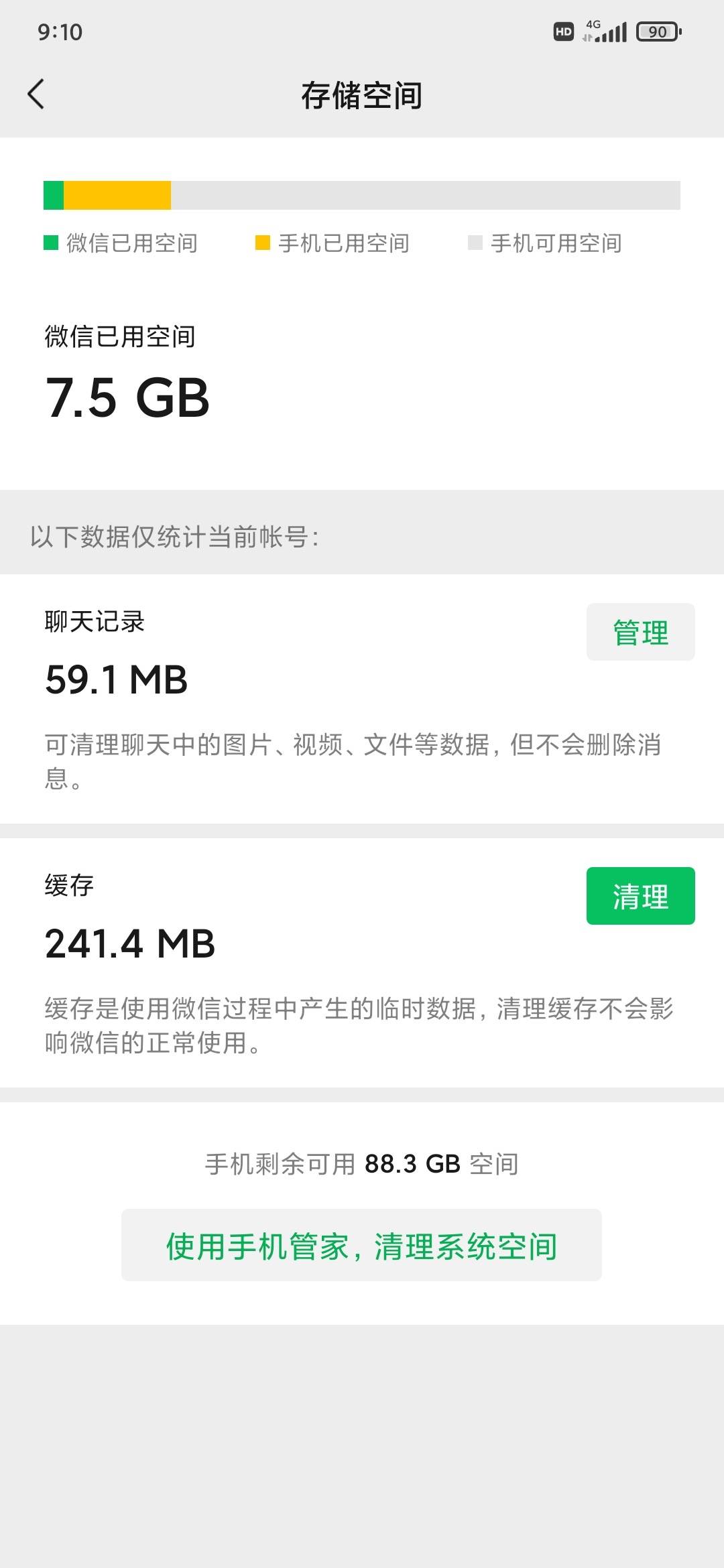 我反复确认了,写的是“微信已用空间7.5G”。下面两个项目加起来都不到512M,这个微信就用7.5G,你不是流氓谁是流氓?