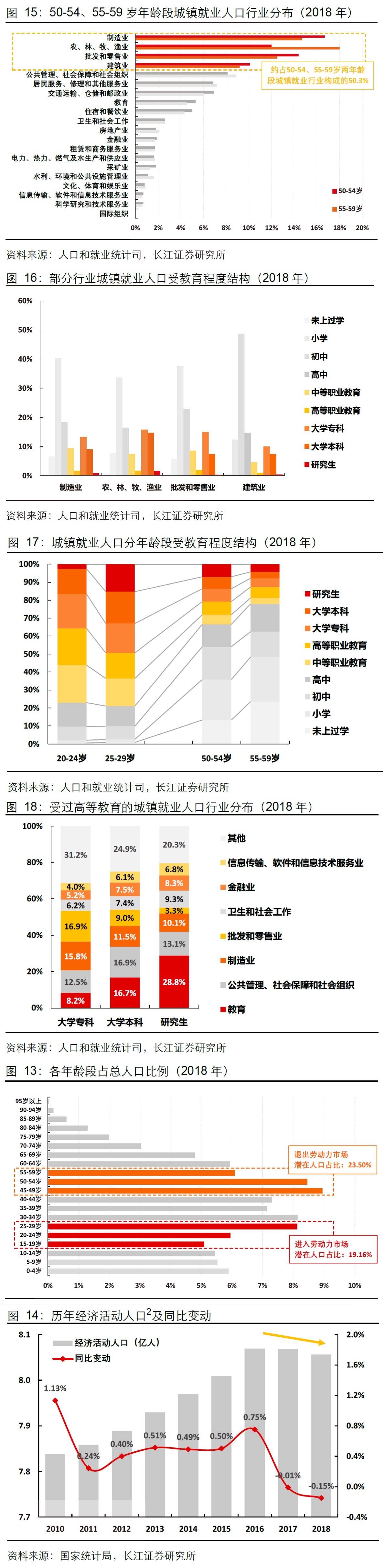 传统行业(农林渔牧、制造业、批发零售、建筑业)就业人口老龄化严重,即将退出劳动力市场,且就业人口逐年降低,第二产业就业人员逐年缩减,城镇率提高的同时城镇净增人口和就业人员却日渐走低(图1⃣️-3⃣️)