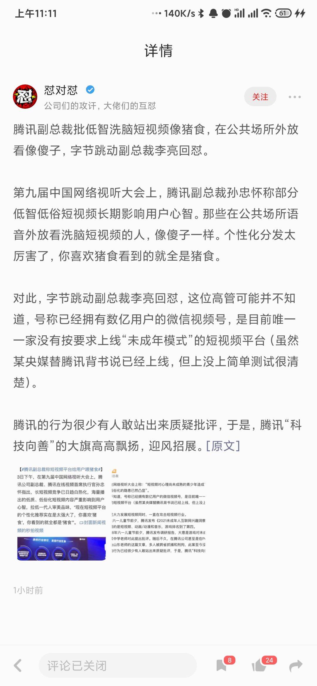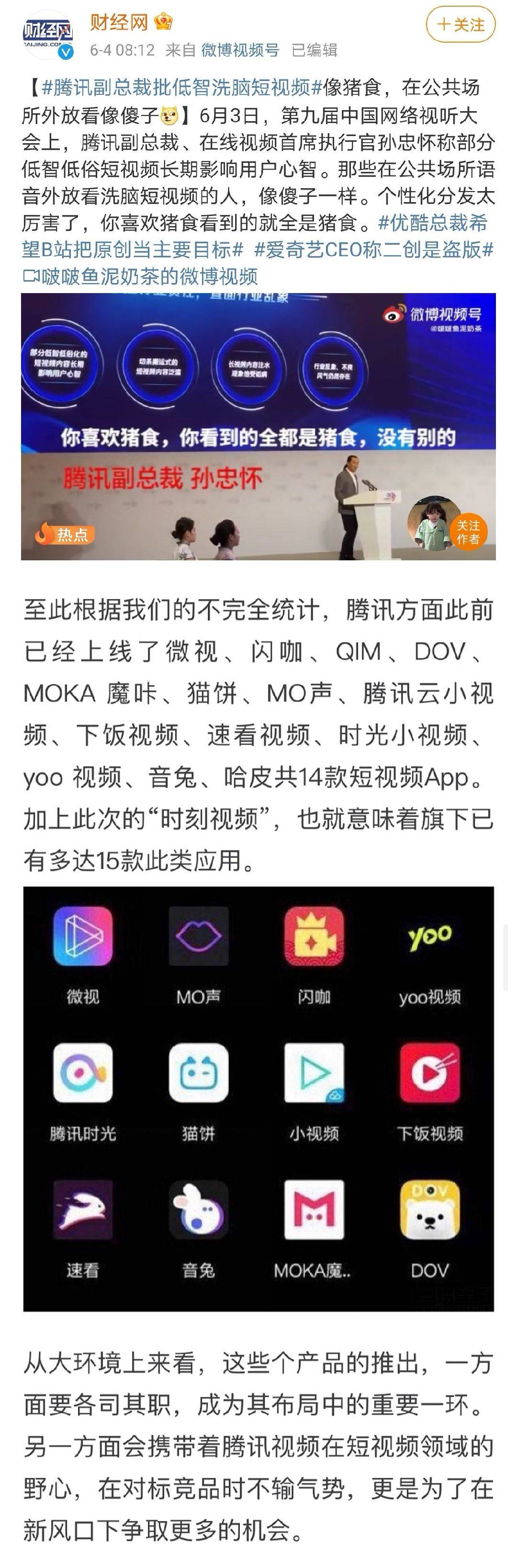短视频这种东西确实是猪食,但是我寻思腾讯也没资格讲这种话啊。