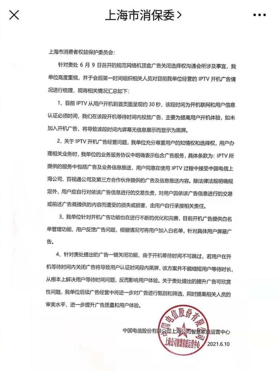上海电信认为 IPTV 开机广告不能关闭是为了提高用户体验🤪