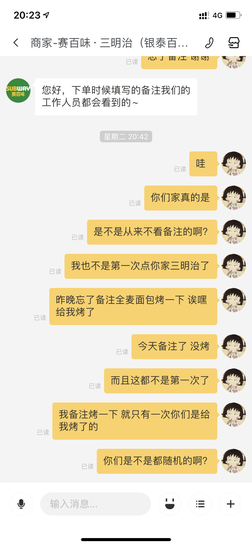昨天终于忍不住反馈了下,今天中午依然没给我烤面包,我也默默吃了,晚上倒是知道把我的订单备注加🌟了 是该夸一下?