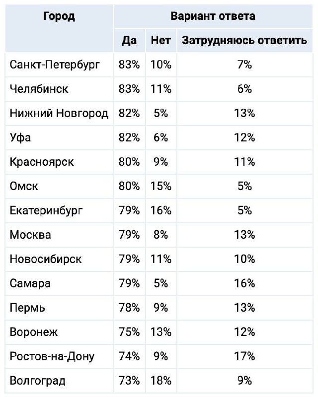 Решение сделать 31 декабря 2020 года нерабочим днем Госдума оставила за главами регионов. На данный момент уже в 14 регионах россияне будут отдыхать в последний день года. Опрос общественного мнения населения городов-миллионников (кроме Казани, где постановление о нерабочем дне уже принято) показал следующие результаты: