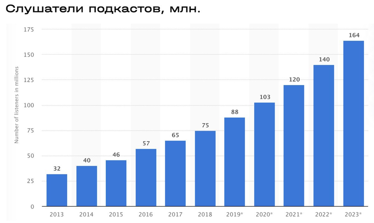 Рынок подкастов лучше всего развит в США. Несмотря на то, что аудиокультура в этой стране всегда была развита хорошо, ведь Америка — это страна радио, потому что там много дорог, взрывной рост популярности подкастов произошел в прошлом году. Количество слушателей подкастов увеличилось на 15 млн — с 88 млн человек до 103 млн. А к 2023 году аналитики прогнозируют рост аудитории подкастов до 164 млн. человек.