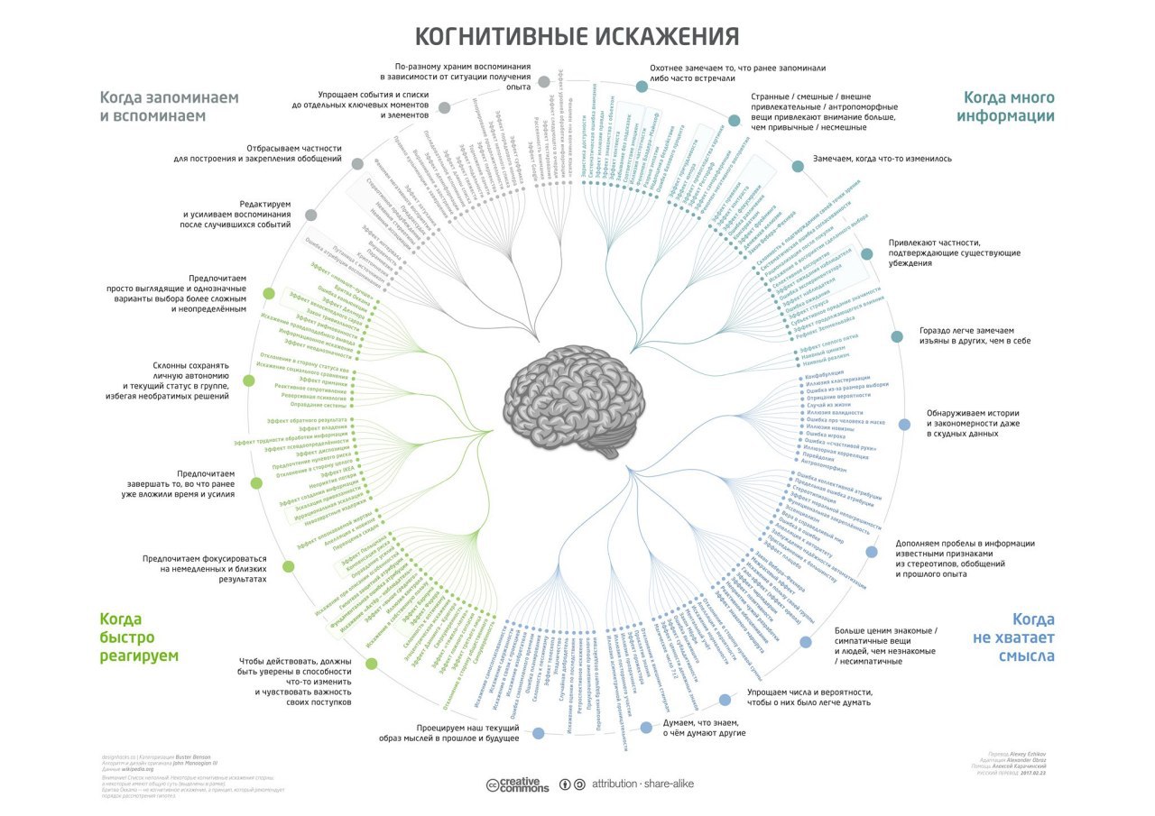 Подборка из разных уголков интернета описаний 176 когнитивных искажений, которые влияют на принятие решений людьми в условиях неопределенности by Roman Kumar Vias (CEO & Founder в Qmarketing, Co-Owner в Qlean, Mentor в 500 Startups)