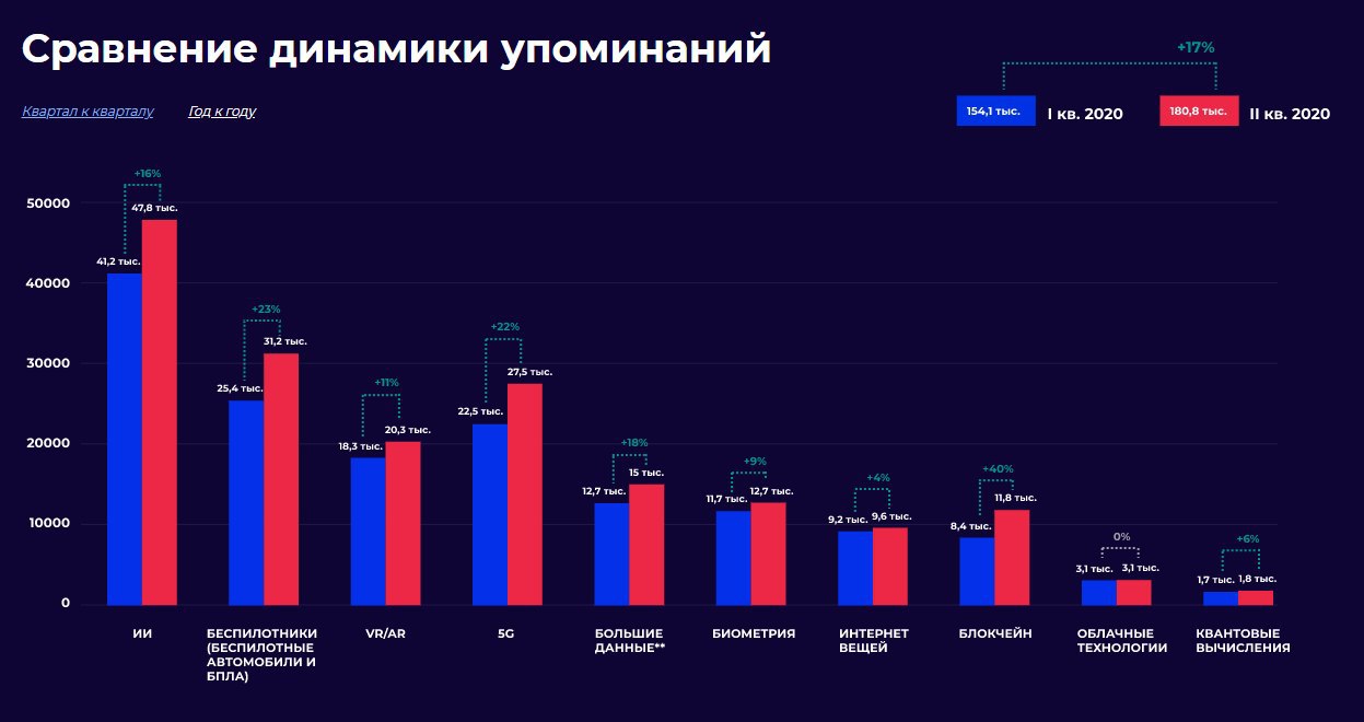 5️⃣✨ Безотносительно «ковидной» повестки статус-кво ИТ-медиатрендов сохранился: в тройку лидеров по упоминаниям вошли ИИ, беспилотники и 5G (робототехника в общем запросе не учитывалась).