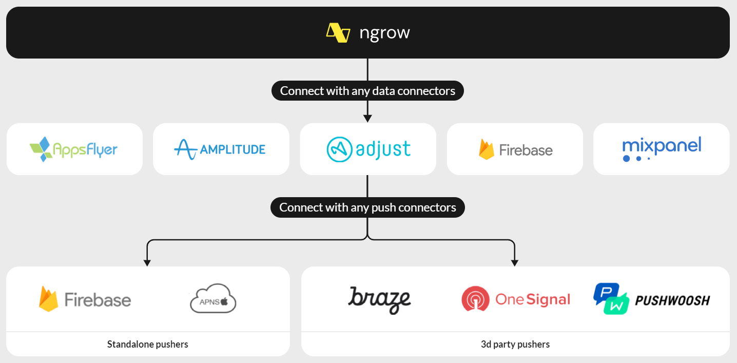 Техническая новизна – отсутствие SDK. Программист приложения не нужен вообще. Информация о событиях берется из интеграции с Amplitude или другой аналитикой, отправка идет через Firebase или тот же OneSignal, если он уже подключен. Добавление nGrow в проект занимает не больше рабочего дня и не требует раскладки в стор.