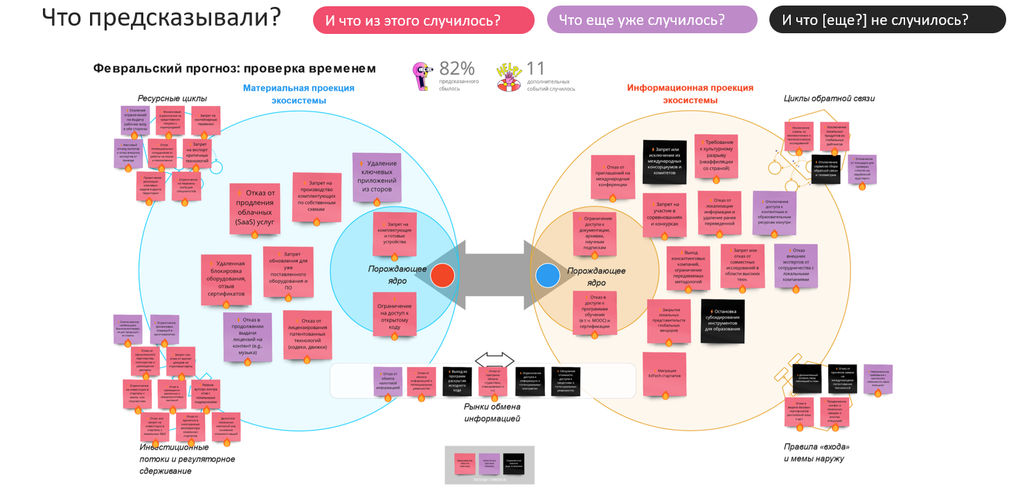 Информационная проекция справа. Там мы обсуждаем, как происходит накопление и выработка знаний в экосистеме, накопление опыта и его передача между разными участниками. Простой пример: IT конференция — это элемент правой части.