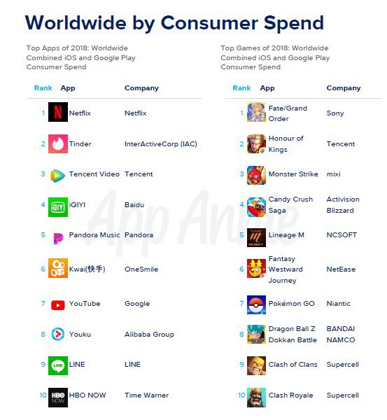AppAnnie включает макро тренды, анализ индустрий (игровики, ритейл, доставка еды, банкинг и другие), статус кво мобильного маркетинга в целом, прогнозы на 2019.Ключевые цифры 2018 года: