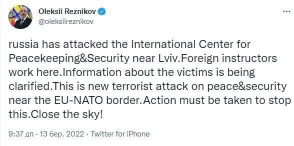 "Это новое террористическое нападение на мир и безопасность у границы ЕС – НАТО. Нужно принять меры, чтобы остановить это. Закройте небо", – заявил глава Минобороны Украины