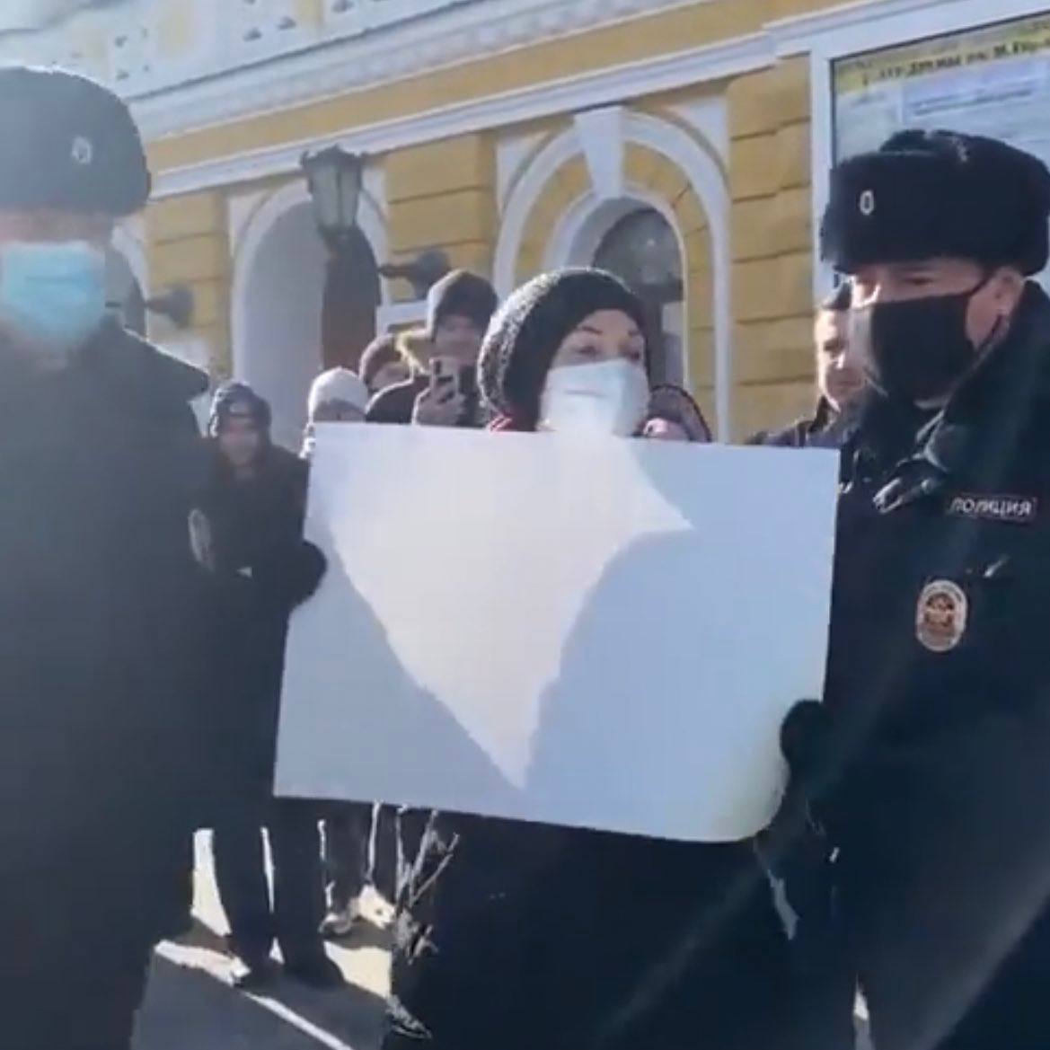 Мужчина выходит на демонстрацию на Красной площади с пустым плакатом в руках.