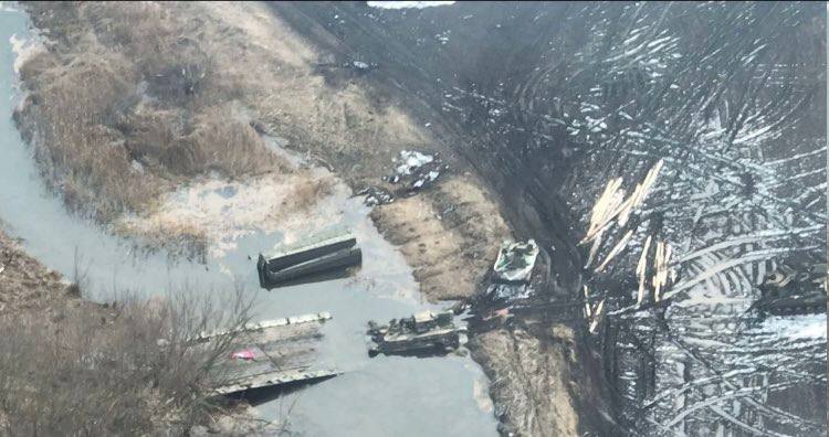 Российская военная колонна направлялась к переправе через реку в районе Гостомеля с мостовыми машинами