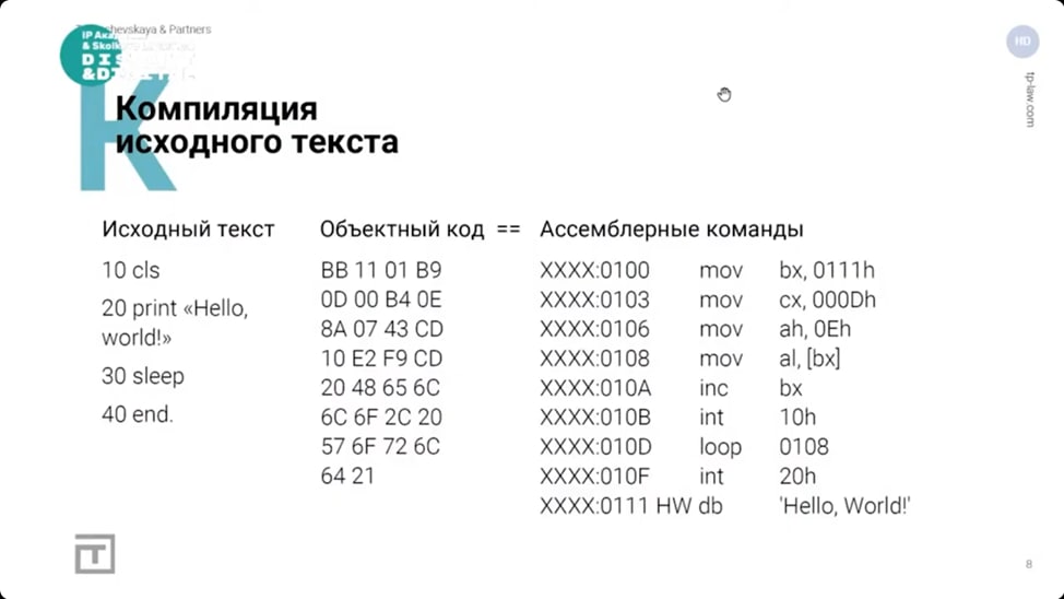 Это значит, что увидеть мы сможем только объектный, а не исходный код (см. рисунок к посту). Объектный код – результат работы компилятора. Но юристам нужно работать с исходным. Простых алгоритмов декомпиляции (а-ля переводчик) не существует. И даже если потратить очень много сил и времени на декомпиляцию, оригинальный код всё равно получить не сможем.