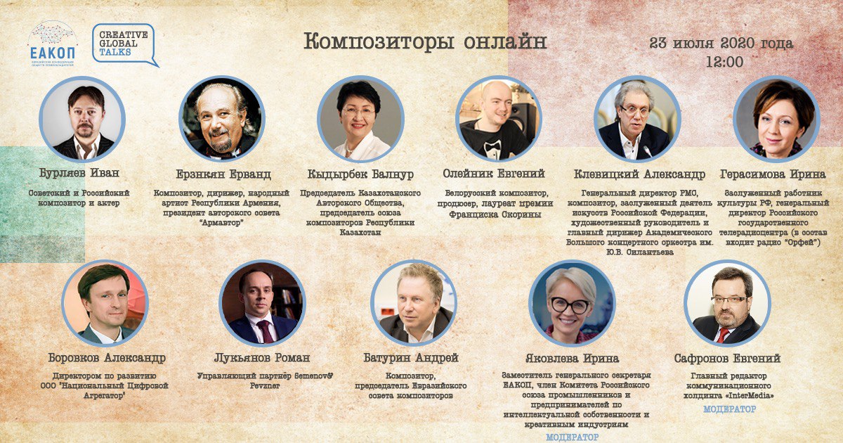 Не пропустите уже завтра, 23 июля, в 12:00 встречу «Композиторы онлайн», которая пройдет в рамках серии дискуссий Creative Global Talks. Zoom-конференция с участием экспертов в сфере интеллектуальной собственности и участников креативных индустрий из России, Армении, Казахстана, Беларуси, а также представителей цифровых площадок будет посвящена актуальным способам эффективного продвижения музыки в цифровой среде и новым возможностям взаимодействия авторов с digital-платформами в ряде стран Евразийского региона.