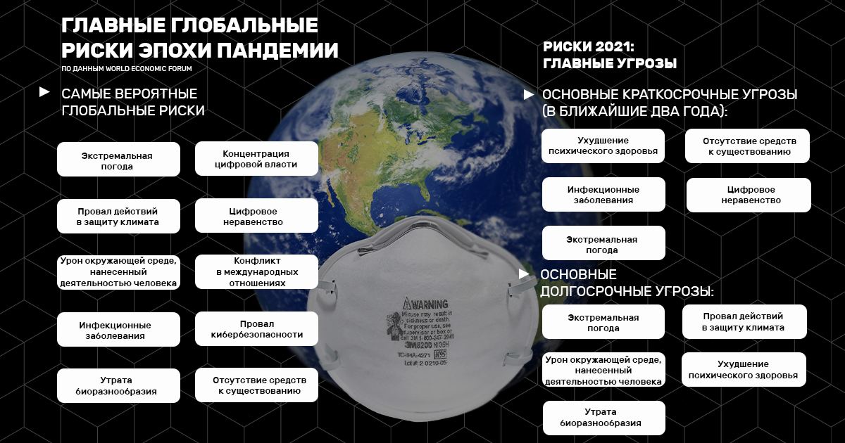По словам аналитиков, эпидемия COVID-19 грозит лишить человечество многолетних достижений в борьбе против бедности и неравенства, еще больше ослабить социальную сплоченность и глобальное сотрудничество. Прошедший 2020 год обернулся для всего мира потерей рабочих мест, расширением технологического разрыва и упущенными возможностями, что дополнило уже имеющиеся и до сих пор не устраненные угрозы: кибератаки, оружие массового поражения и изменение климата.