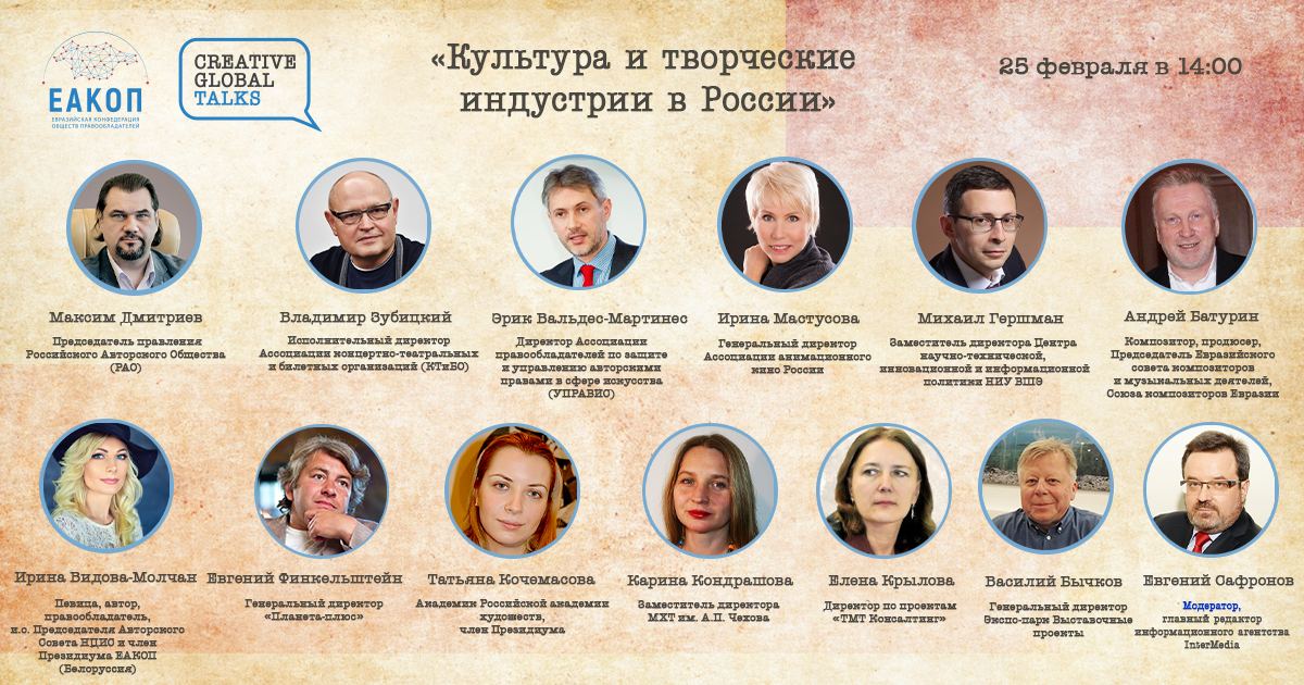 Новая встреча серии Creative Global Talks, организованная Евразийской конфедерацией обществ правообладателей (ЕАКОП), состоится 25 февраля в 14:00 (время московское).
