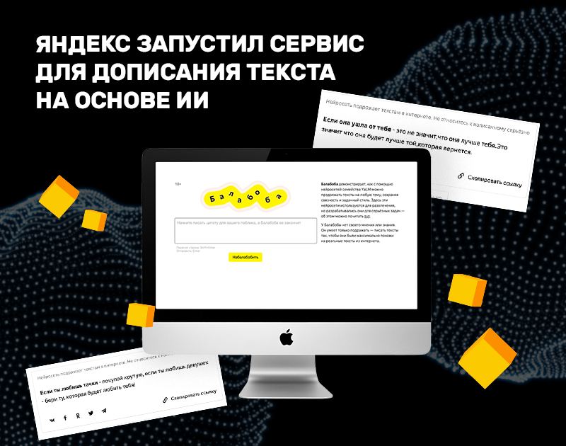 Сервис «Балабоба» от «Яндекс» будет дописывать тексты за пользователем. Его работа осуществляется на базе нейросети семейства YaLM.