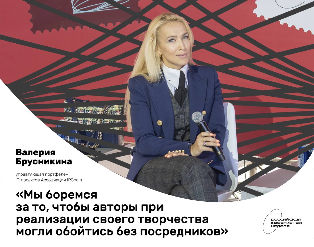28 августа в павильоне «Музыка и саунд-дизайн» в рамках Российской креативной недели прошла презентация цифровой платформы для покупки и продажи объектов интеллектуальной собственности IPEX. В ней приняли участие управляющая портфелем IT-проектов Ассоциации IPChain Валерия Брусникина и создатель музыкального проекта ESTRADARADA Александр Химчук.
