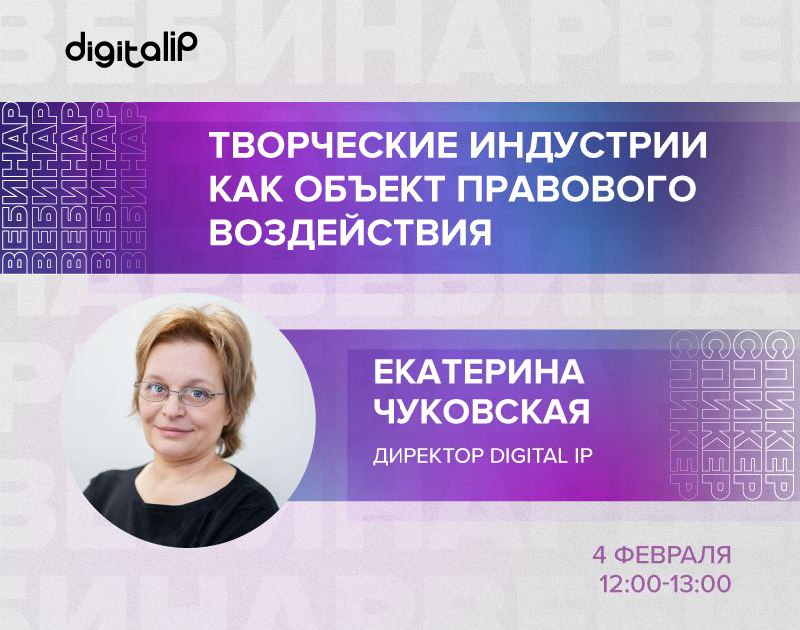 4 февраля директор Научно-образовательного центра интеллектуальной собственности и цифровой экономики Digital IP Екатерина Чуковская выступит спикером на вебинаре «Творческие индустрии как объект правового воздействия», организованном Legal Academy в рамках практикума «Право креативных индустрий».