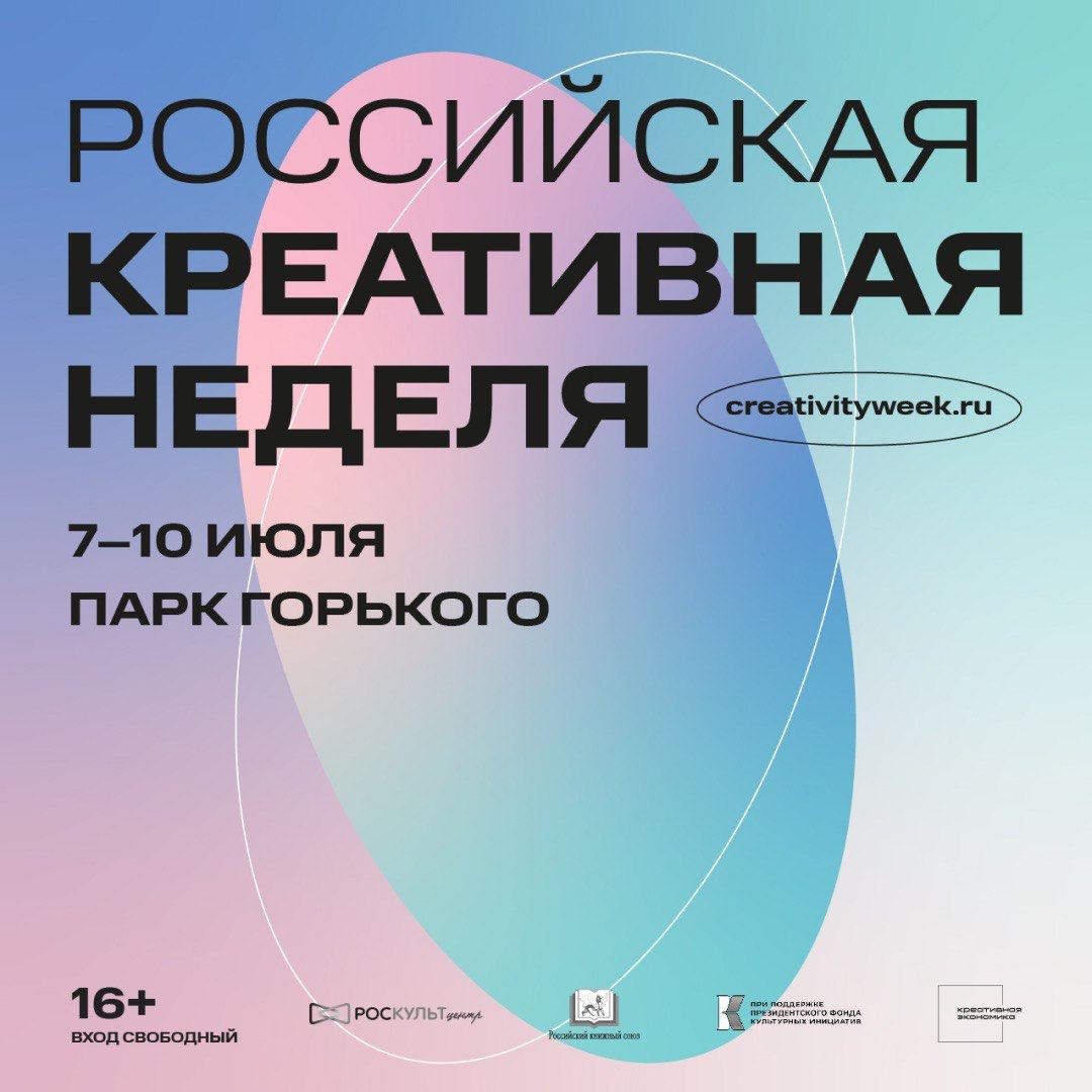 7‒10 июля в парке Горького пройдет «Российская креативная неделя» — крупнейший федеральный форум для представителей творческих индустрий. За четыре дня выступят более 1000 спикеров из сферы музыки, моды, дизайна, архитектуры, кино, компьютерной графики, разработки, IT. Организаторами мероприятия в этом году стали Роскультцентр, АНО «Креативная экономика» и Российский книжный союз при поддержке Президентского фонда культурных инициатив.
