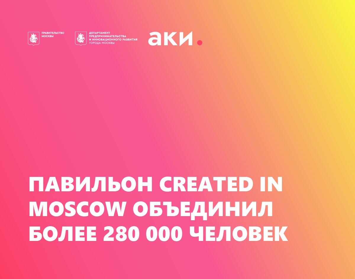 Во время «Российской креативной недели» свой павильон представили Департамент предпринимательства и инновационного развития города Москвы и Агентство креативных индустрий (АКИ). С 7 по 10 июля в Created in Moscow прошло более 100 мероприятий, 50 мастер-классов и 30 сессий с участием 122 спикеров.